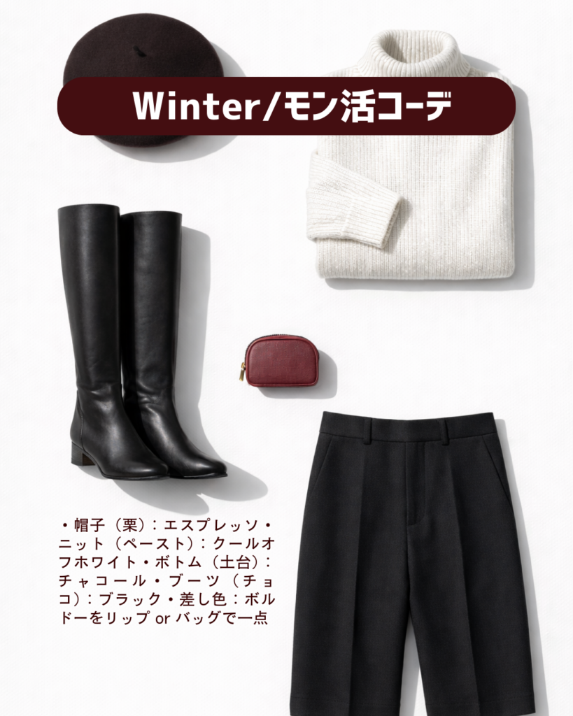 | 12タイプ | 帽子(栗) | ニット(ペースト) | ボトム(土台) | ブーツ(チョコ) | 差し色(任意) |
