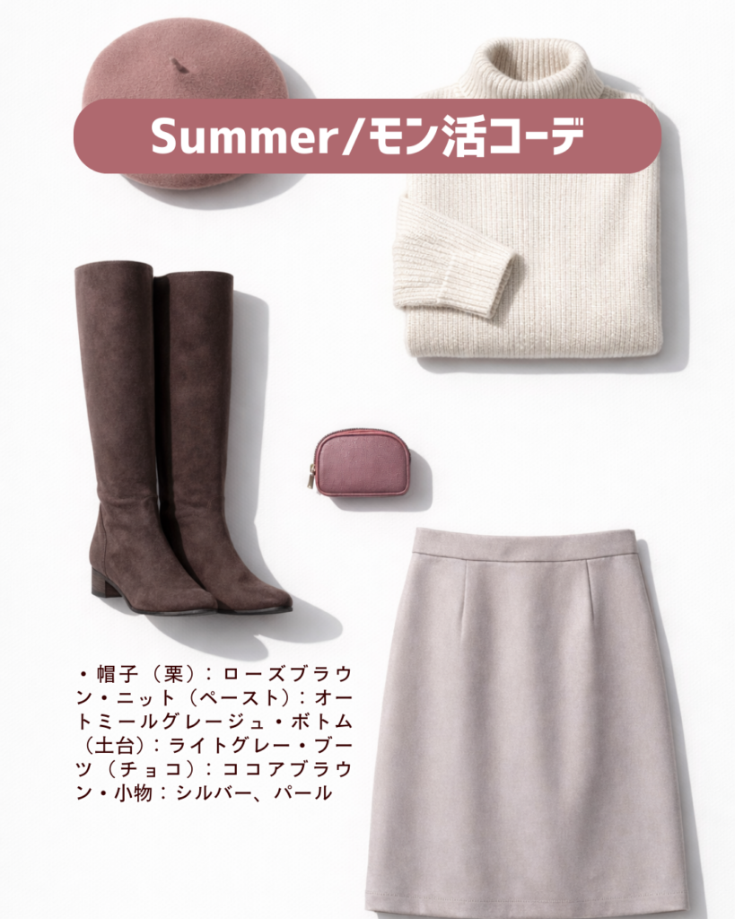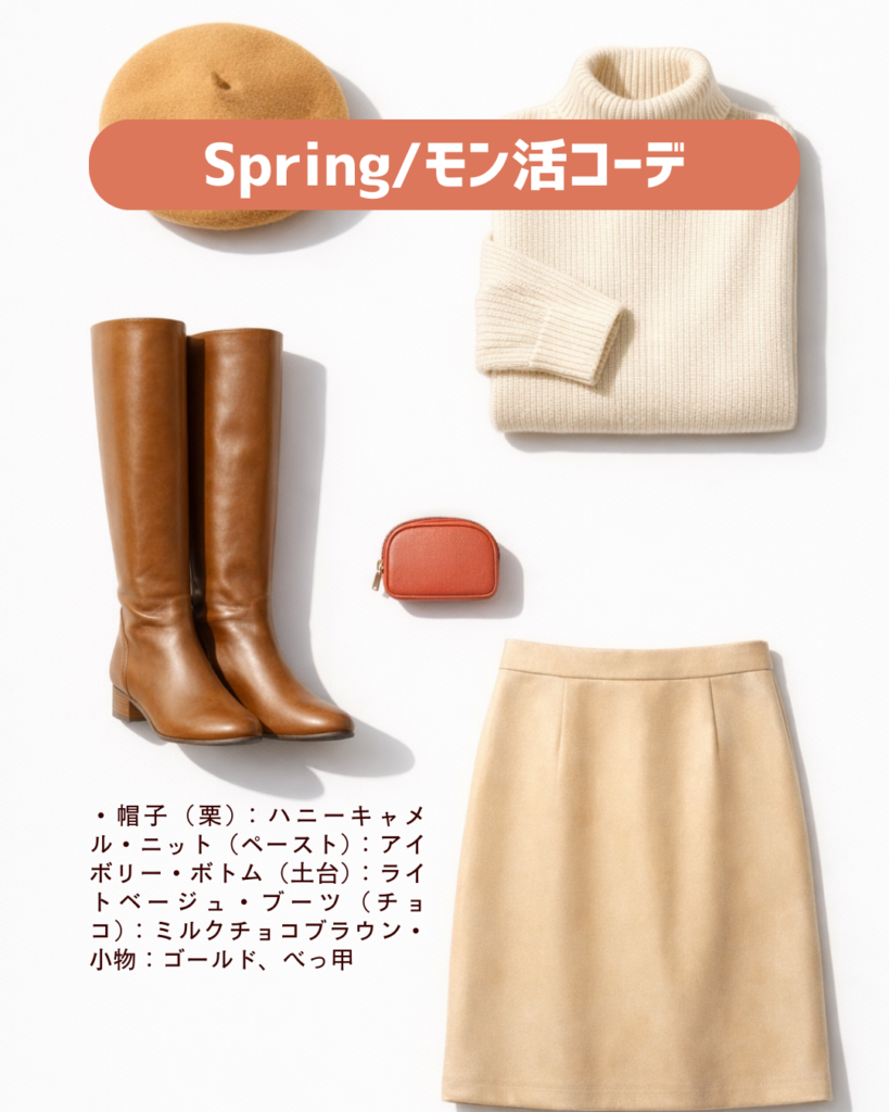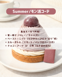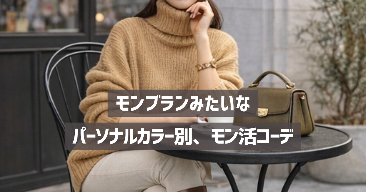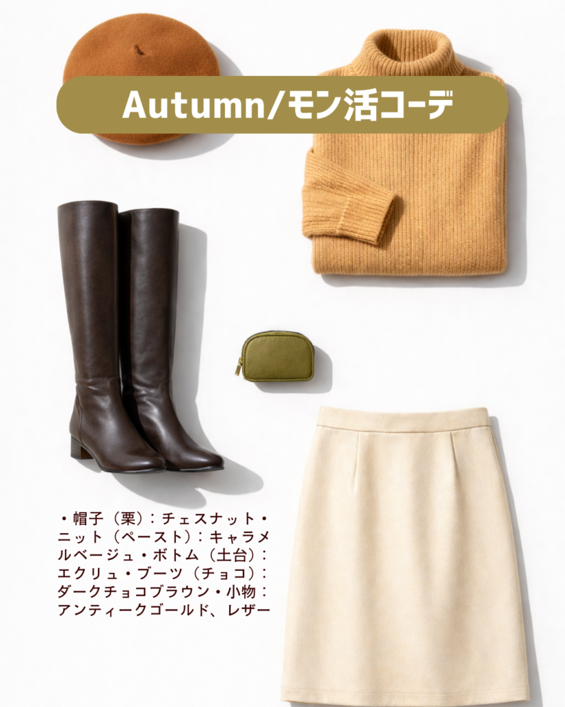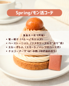 この「モンブラン配色」を、パーソナルカラー別に着こなせるように組み立てたのが、今回ご紹介する「モン活コーデ」です。