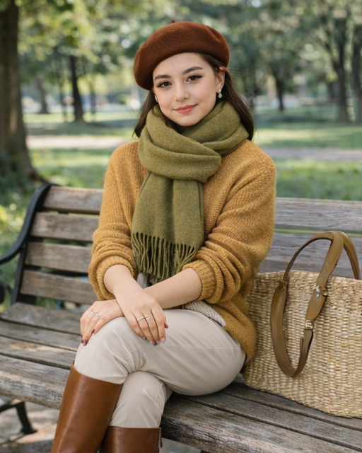 栗のような帽子、モンブランクリームみたいなニット、タルト生地のようなボトム、ビターチョコ色のロングブーツ。そしてひとくちサイズの差し色小物。