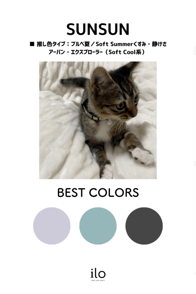このサロンでは、自然光のもとでパーソナルカラーを丁寧に合わせ、猫たちの穏やかな気配と一緒に過ごす時間をご用意しています。緊張がほどけて、鏡の前でふっと笑える。その瞬間をいちばん大切にしています。