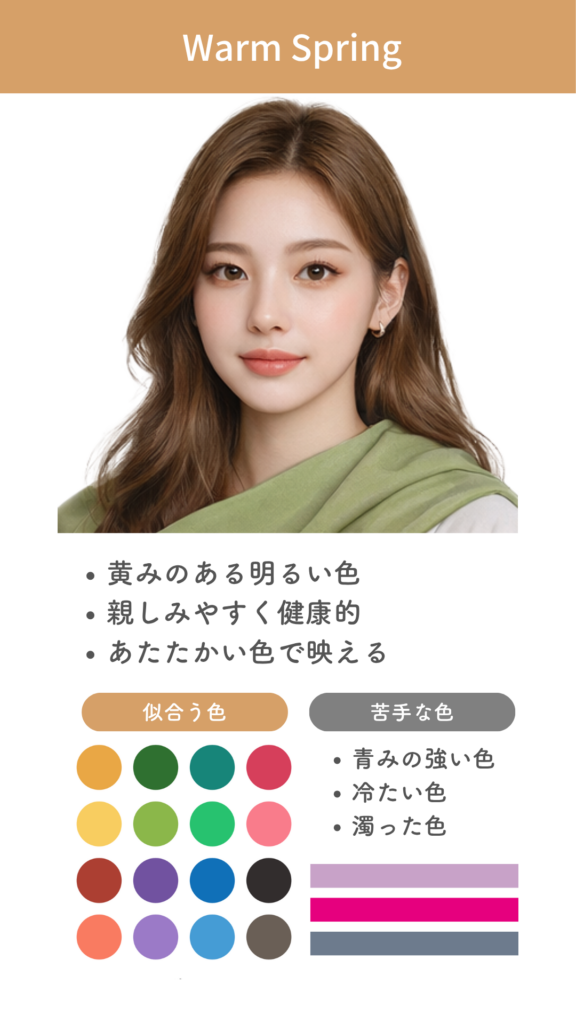 このページでは、Warm Spring の印象、似合う色、苦手な色の方向性を、できるだけわかりやすく整理していきます。